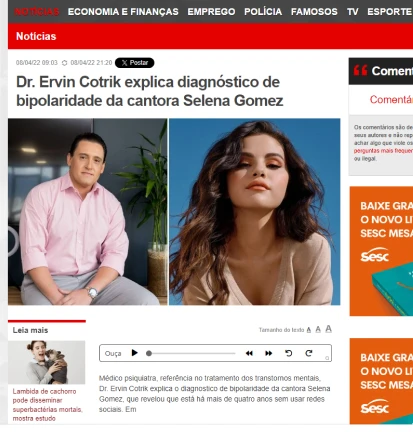 Gloria Maria de Miranda Evaristo17/01/2025 Com a pandemia desenvolvi uma crise de ansiedade generalizada e graças a Deus tive a indicação, através de uma amiga, do dr. Ervin, que me atendeu, e me curou dessa crise que nunca havia passado. Excelente profissional e ser humano, nos escuta com atenção, orienta, e está sempre disposto a nos ajudar em caso de necessidade. Tenho imensa gratidão a ele por tudo. Luiza03/01/2025 Passei uma vida lutando contra o transtorno bipolar. Quando tive uma crise mais séria somente o dr Ervin, às vésperas do Natal de alguns ano atrás, aceitou o meu caso. Jamais achei que conseguiria ter o equilíbrio que tenho hoje. Descobri que havia sido mal medicada a minha vida toda. Ele me disse que eu tinha que confiar no processo e assim o fiz. Hoje me faltam palavras pra descrever o tamanho da minha gratidão. Adriana Gameiro12/12/2024 Doutor Ervin Cotrik é um excelente profissional da psiquiatria. Estudioso, aplicado, atento e humano, atua no mundo acadêmico como pesquisador e professor, sem prejuízo dos atendimentos em consultório e em organizações não governamentais. Ainda, incansável na divulgação da saúde mental, confere palestras educativas, participa de programa de TV e suas lives nas redes sociais alcançam números expressivos. É um médico que efetivamente se importa com seu paciente. Recomendo muito a quem precisa! Mayara Caetano da Costa06/12/2024 O tratamento com Dr. Ervin, vem me fortificando, equilibrando e me mostrando que a vida pode e deve ser vivida com qualidade e saúde mental. O trabalho de resgate individual e na esfera social realizado por Dr. Ervin é lindo! Através de constante disseminação e desmistificação da Psiquiatria, combate o preconceito, possibilita acesso a tratamento por meio de projetos sociais, viabiliza acesso à informações e assim, salva vidas. Cheio de humanidade, generosidade, competência e ética. Por todos esses motivos me sinto segura e acolhida. O que é de extrema importância para ressignificar a vida e encontrar motivação para dar continuidade ao tratamento. Eu sempre digo que no trabalho desempenhado por Dr. Ervin além de todo conhecimento e domínio da técnica, existe um dom muito bonito dado por Deus... É como aquela citação de Carl Jung: "Conheça todas as teorias, domine todas as técnicas, mas ao tocar uma alma humana, seja apenas outra alma humana." Eu sou muito grata por sua alma enxergar a minha e por ser tratada e cuidada com toda humanidade necessária para vencer a vulnerabilidade. Que Deus abençoe seu lindo dom e sua vida tão valiosa. Muito obrigada por tudo! Mariana Castro04/12/2024 Dr.Ervin Cotrik, um profissional de excelência.,e eu como sua paciente quero expressar minha admiração pelo seu trabalho incansável e dedicação aos pacientes. Você faz a diferença na vida de muitas pessoas e merece todo o reconhecimento. Parabéns! Thais Thomazini03/12/2024 Dr. Ervin é um excelente profissional, além de atencioso, ético, humano e cuidadoso com seus pacientes. Faço tratamento com ele há alguns anos e desde a primeira consulta ele me esclareceu dúvidas e me fez entender sobre meu problema e sobre como funcionavam os medicamentos, o que fez toda diferença no tratamento. São raros os médicos que se importam e amam a profissão. Recomendo demais o Dr. Ervin Cotrik, psiquiatra fantástico. Ivania Silva03/12/2024 Bastante positiva. Excelente médico e um ser humano maravilhoso Marcela Quirino03/12/2024 O tratamento com Doutor Ervin tem sido um divisor de águas na minha vida. Desde a primeira consulta, em Março de 2024, saí de um estado de prostração e voltei a ser ativa e funcional e o melhor tem sido a estabilidade mantida até aqui. A meu ver, ele é um médico de uma humanidade rara aliada a explicações objetivas e simples ao meu entendimento. Ele é acessível e continua me atendendo diante da necessidade de esclarecimentos e de avaliação dos demais tratamentos que tenho feito. Recomendo seus serviços sem reservas. Gratidão Doutor❤️